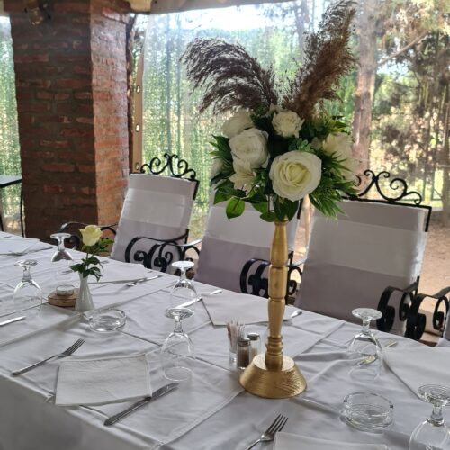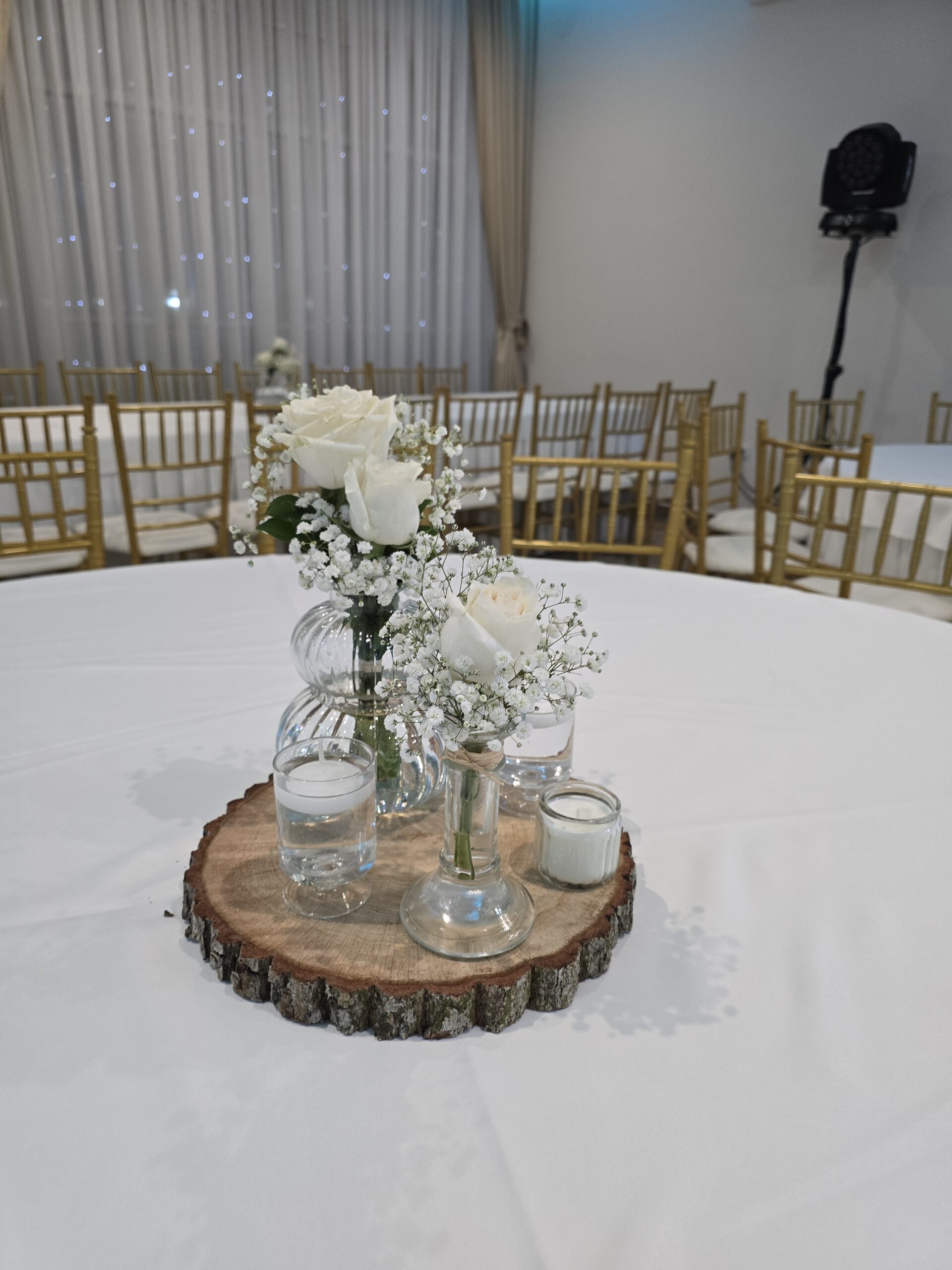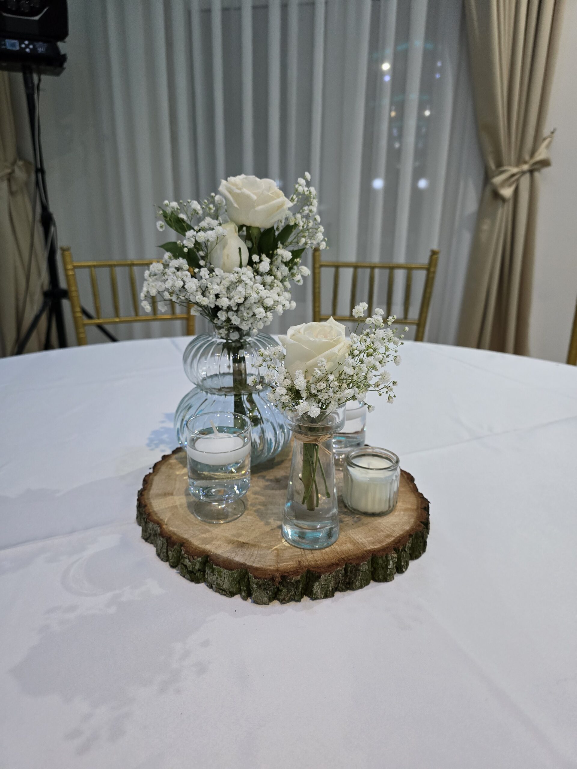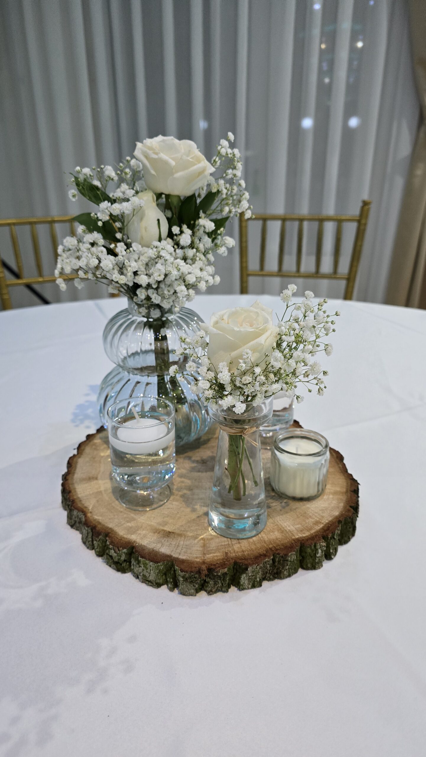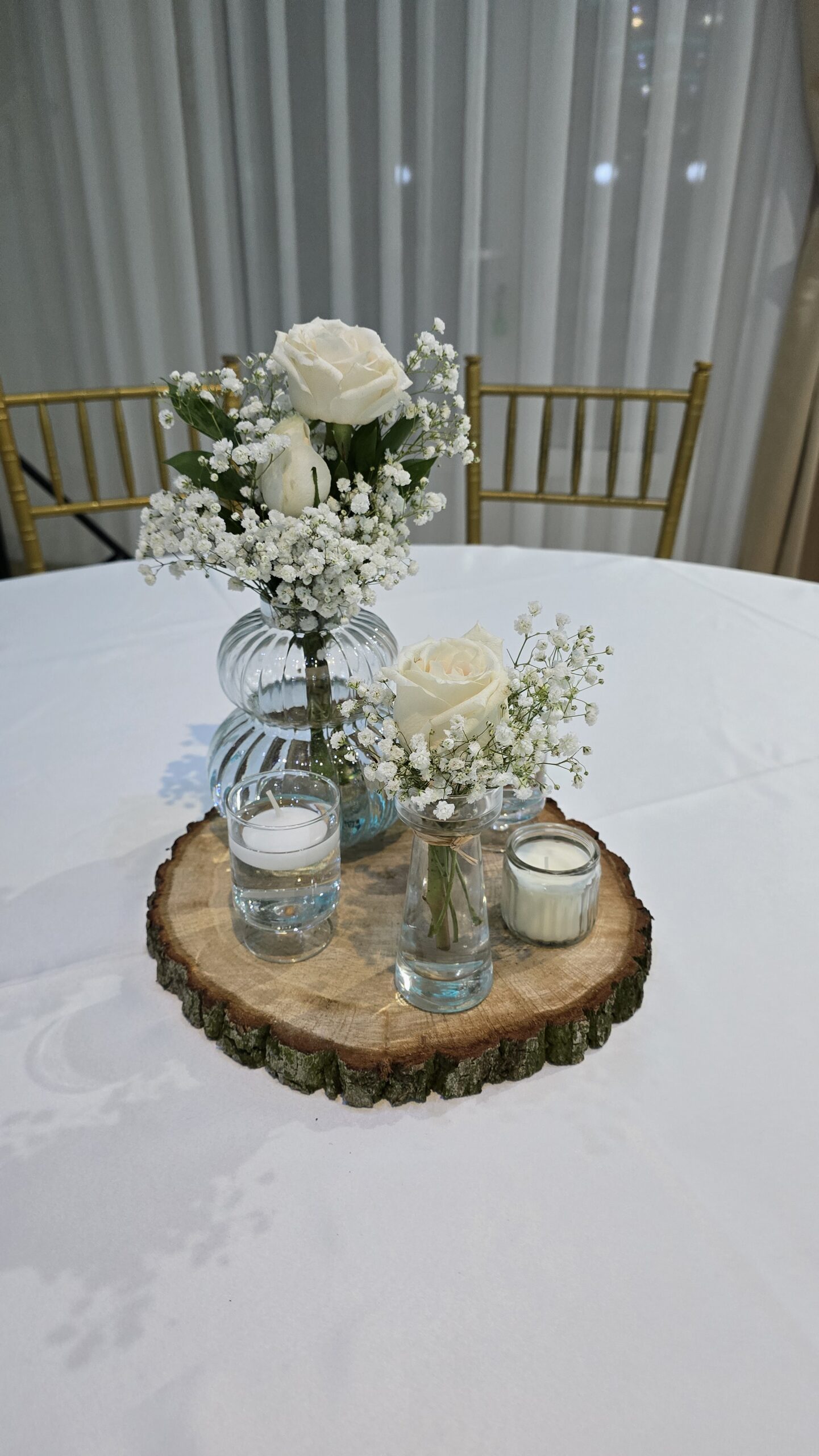 Vaze sa prirodnim cvećem po izboru , 3 sveće , na drvenom postolju