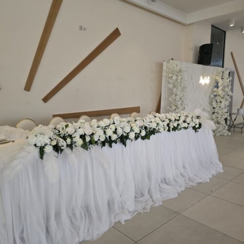 Dekoracija od prirodnog cveća na mladenačkom stolu 14000 dinara. Najam suknjice od tila na mladenačkom stolu 3500 dinara. Pozadina iza mladenačkog stola dekorisana svilenim cvećem 18000 dinara