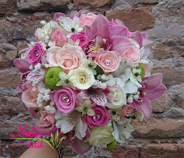 jedan od naših omiljenih bidermajera, spoj orhideja i ruža, sa alstromerijom i ornitogalumom
