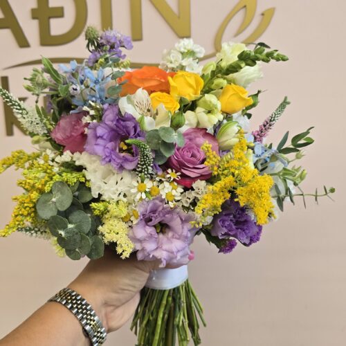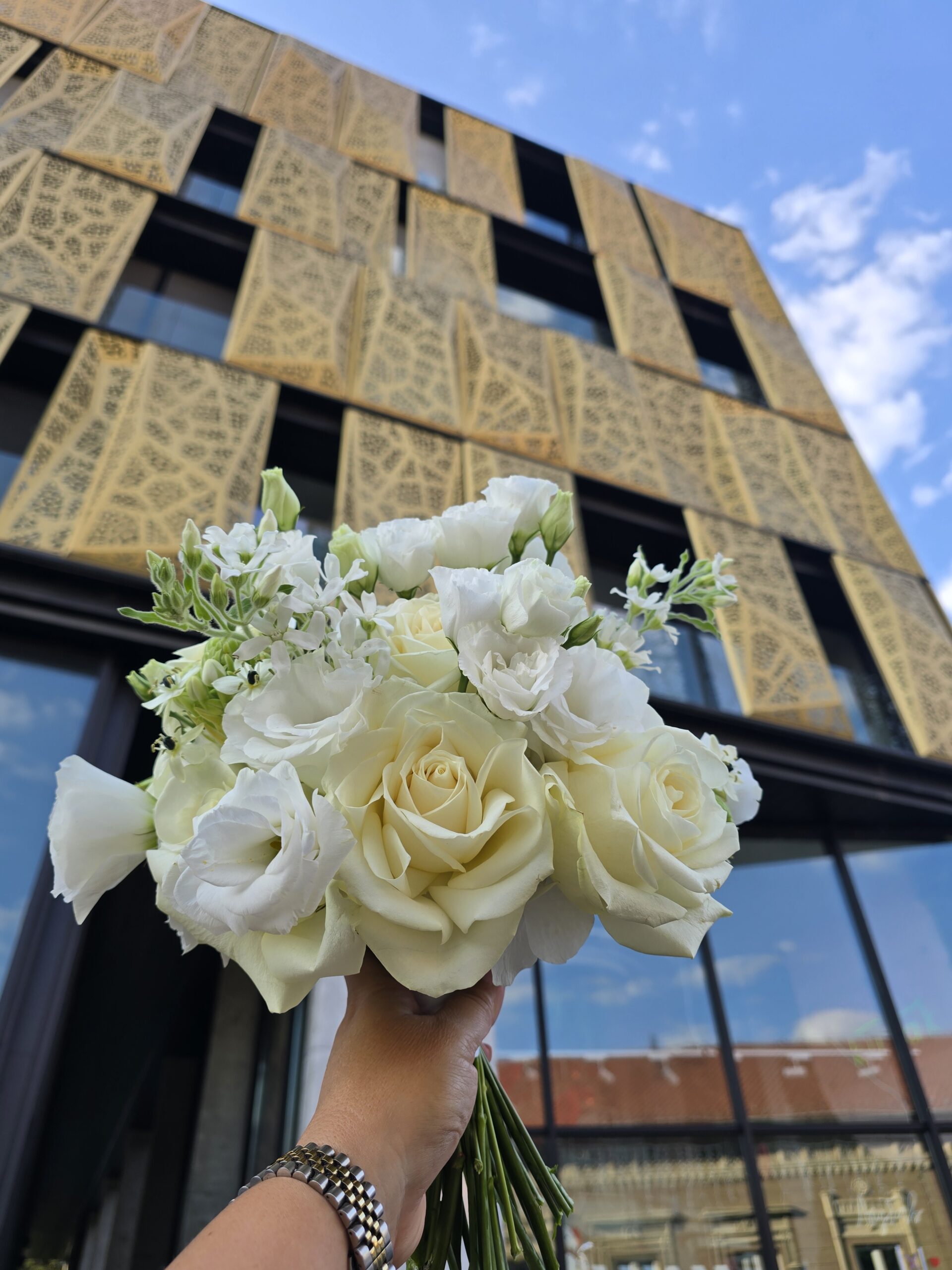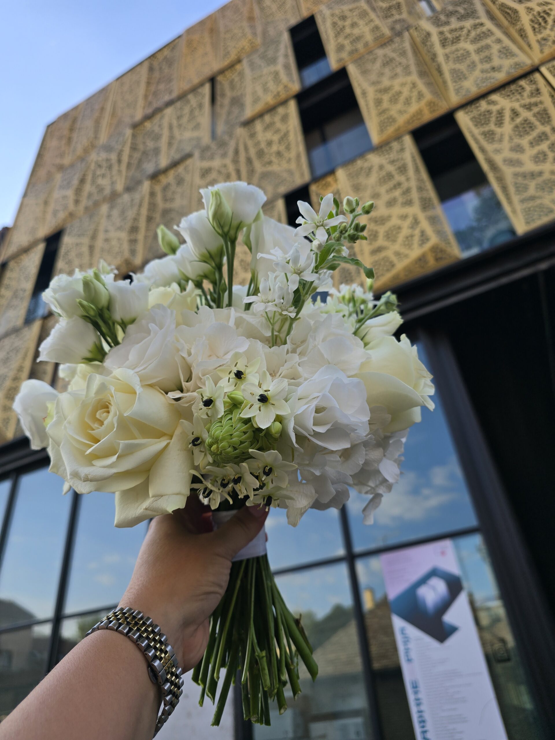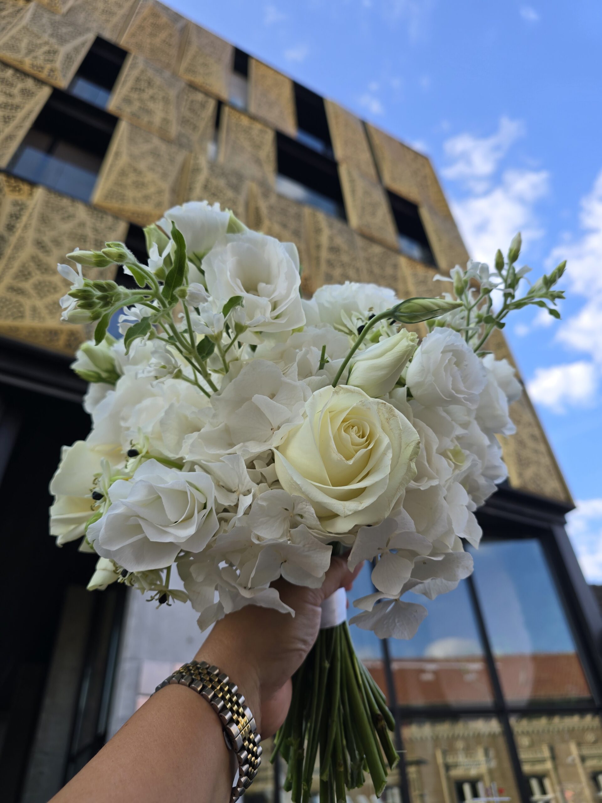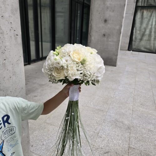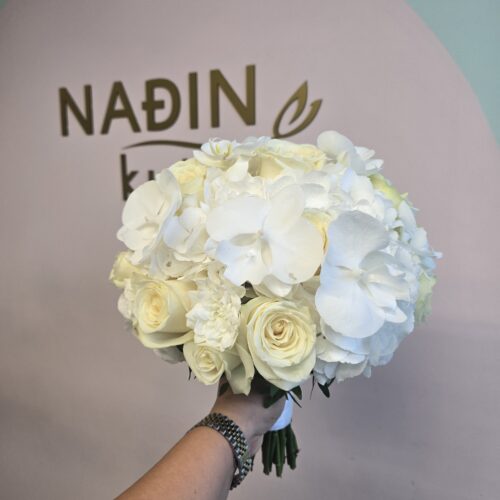 Raskošan beli bidermajer sa hortenzijama , otvorenim ekvadorskim ružama, lizijantusom , belom tvidijom , karanfilom ….