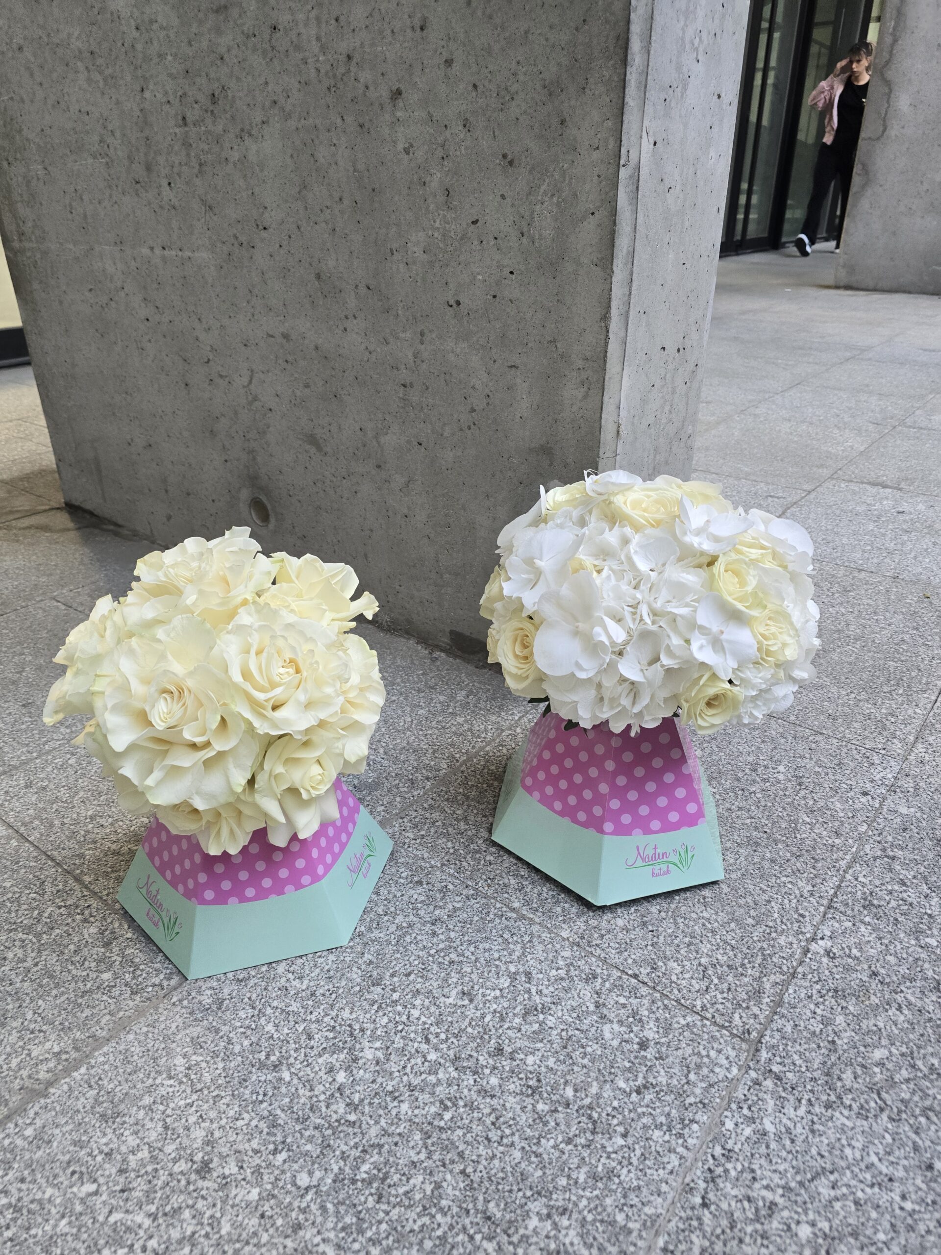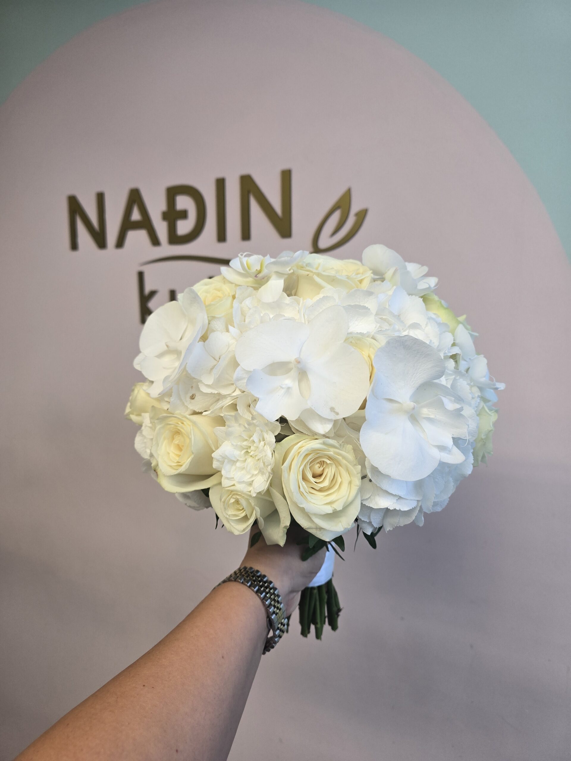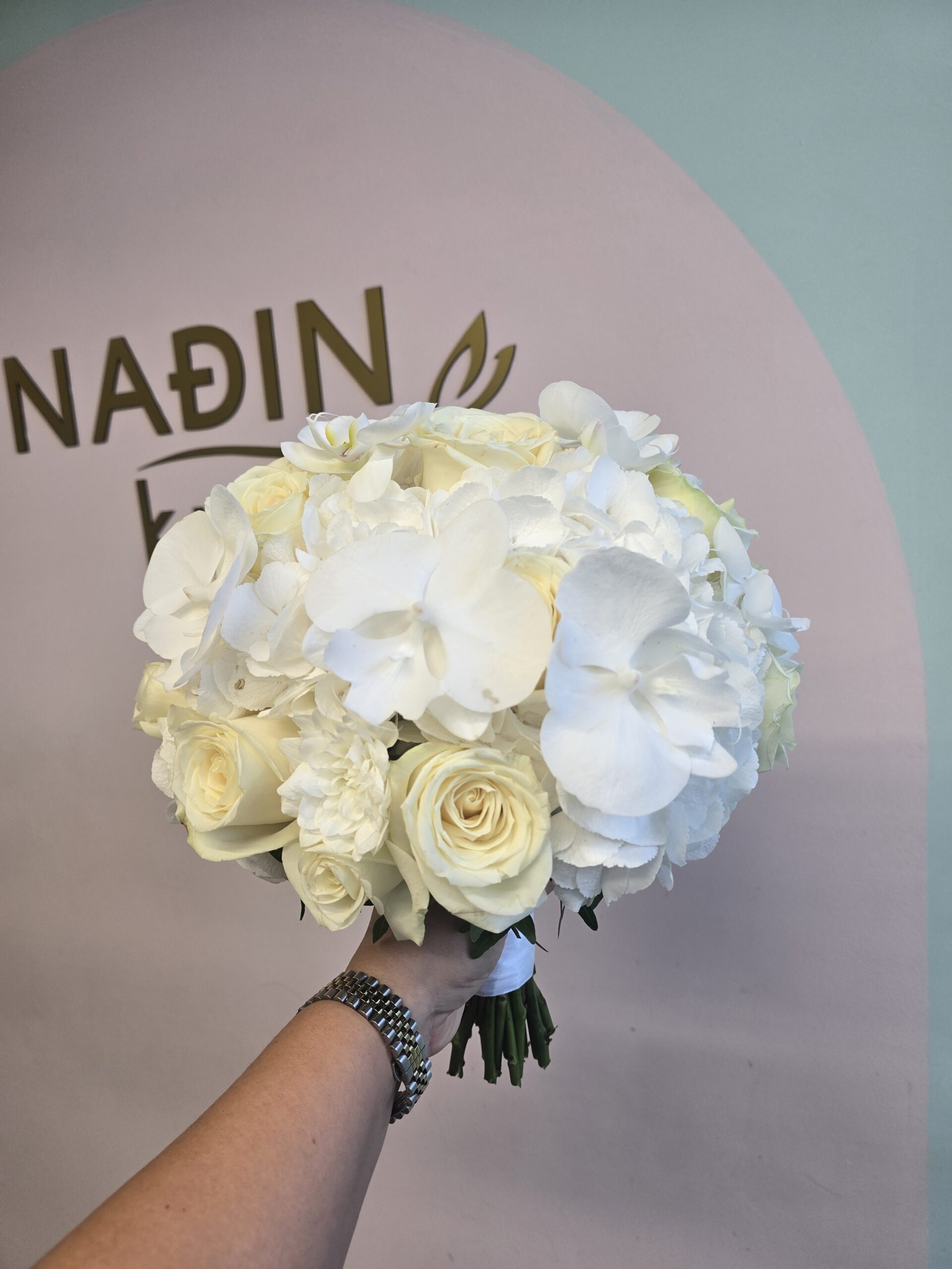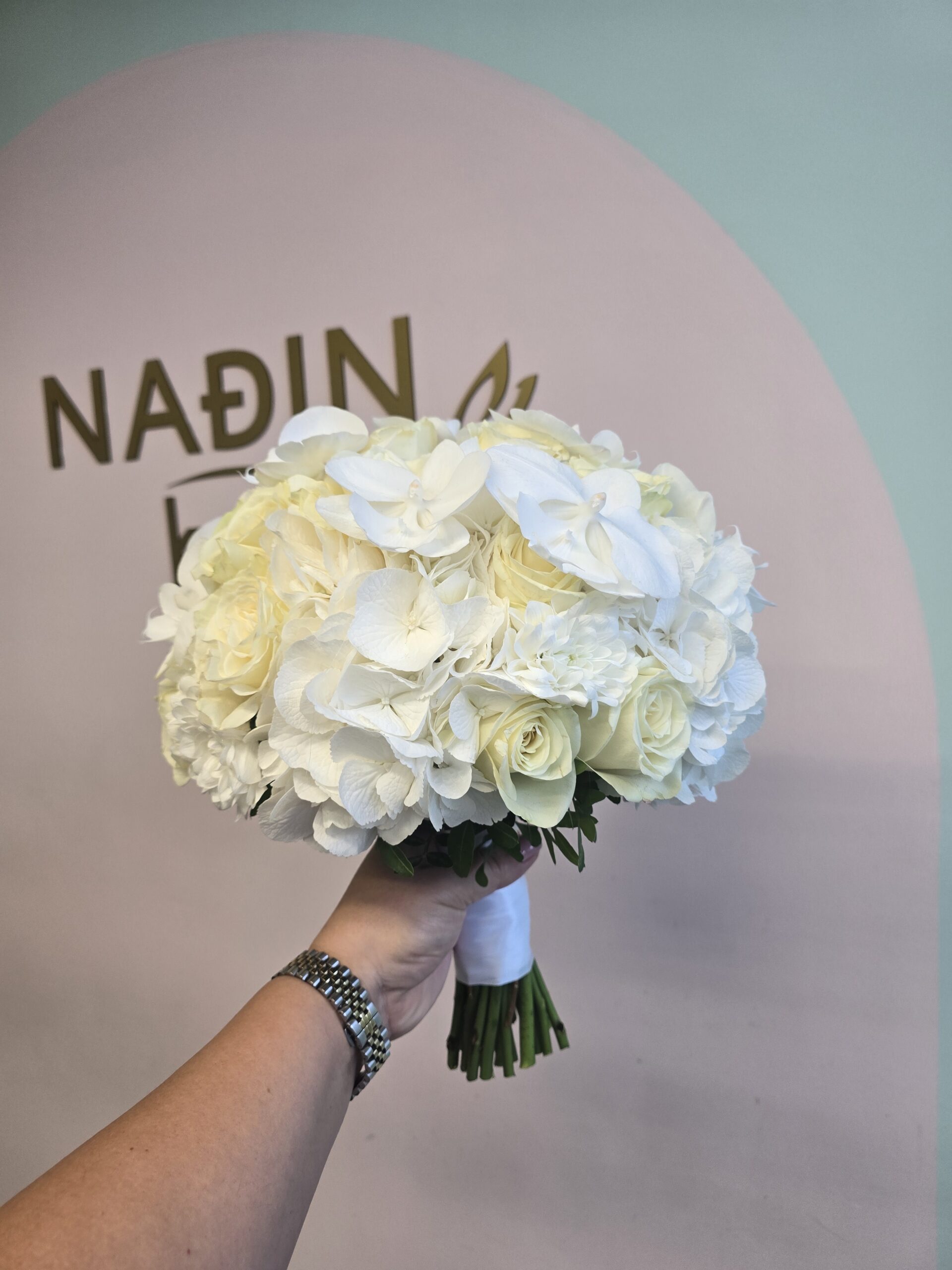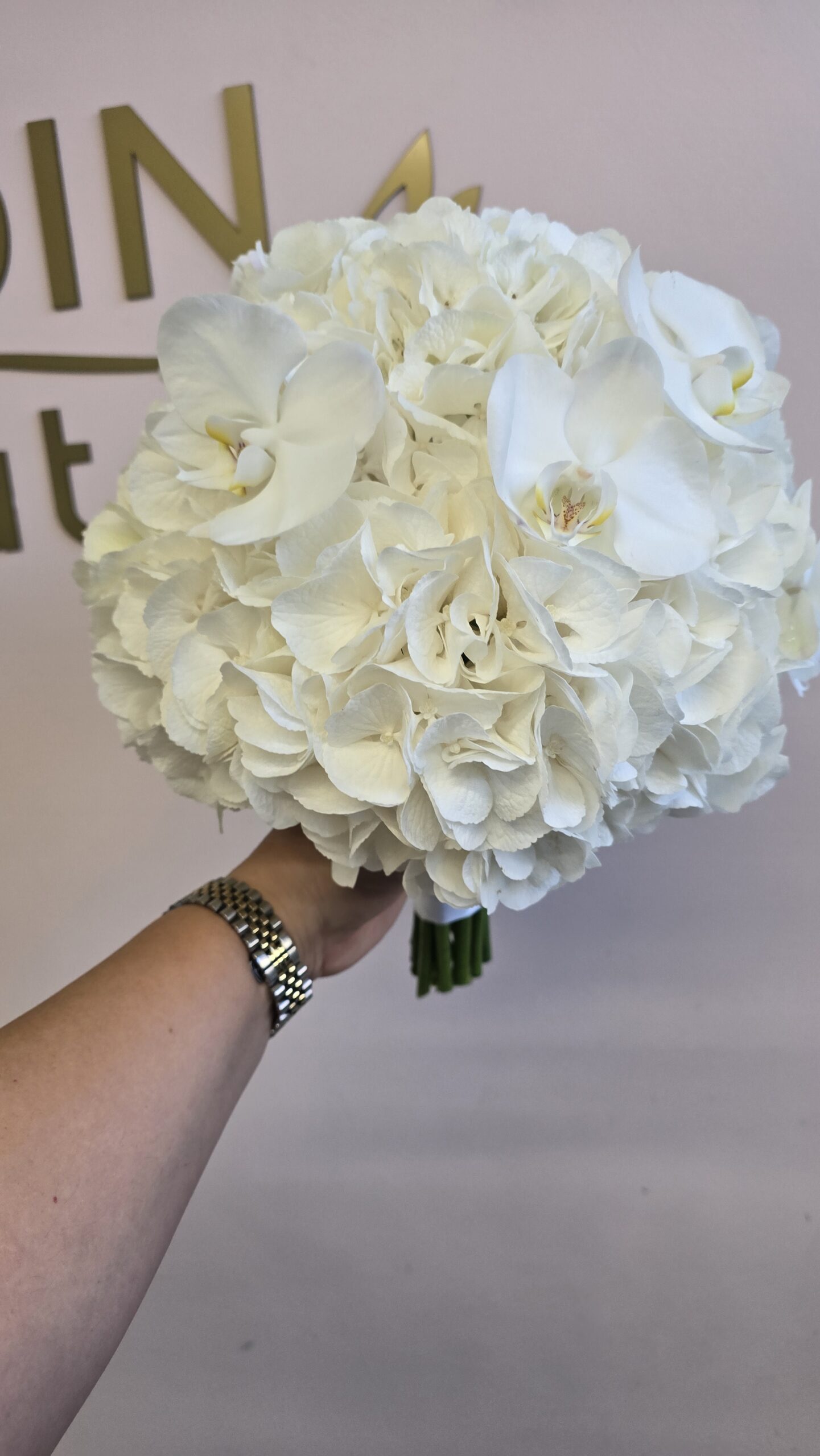 Hortenzija, ruže i orhideje – veliki loptast beli bidermajer.
