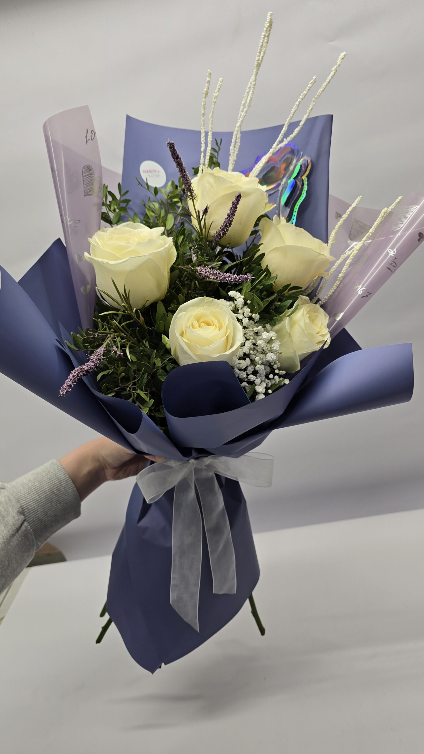 Buket sa 5 belih ekvadorskih ruža, boja pakovanja može biti po želji.