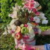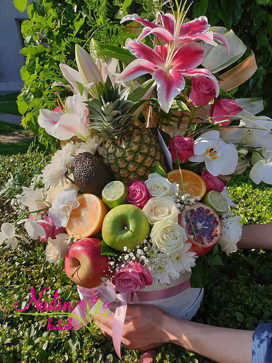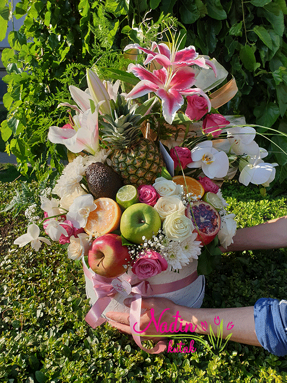 kutija sa orhidejom u saksiji, voćem i cvećem,