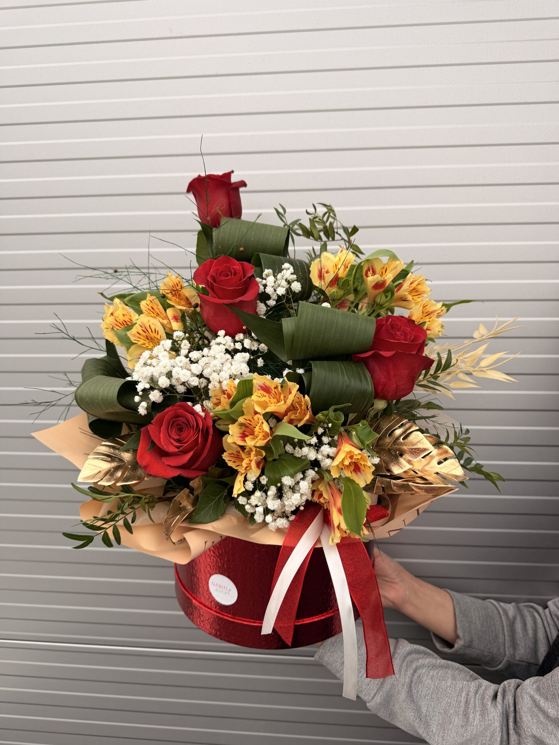 Ekvadorske ruže i alstromerije u aranžmanu u kutiji