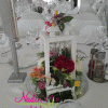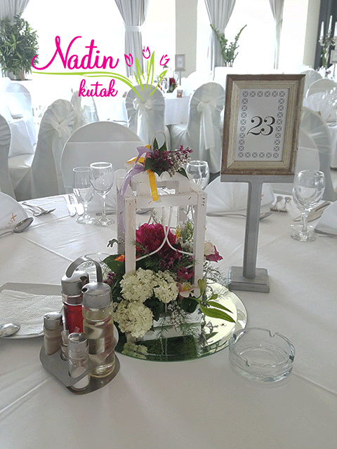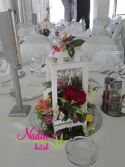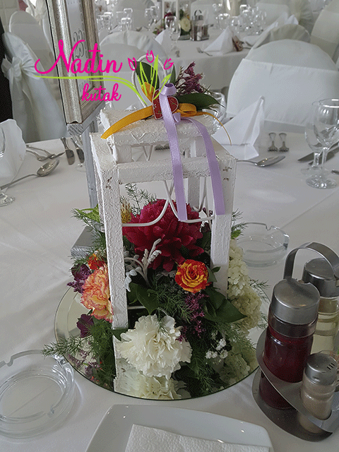 drveni fenjer sa sezonskim cvećem , aranžman koji poklanjate svojim gostima