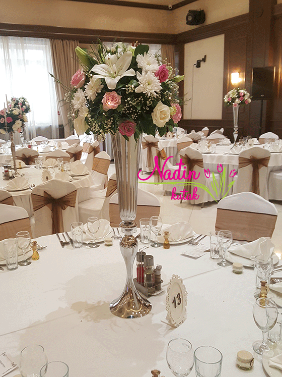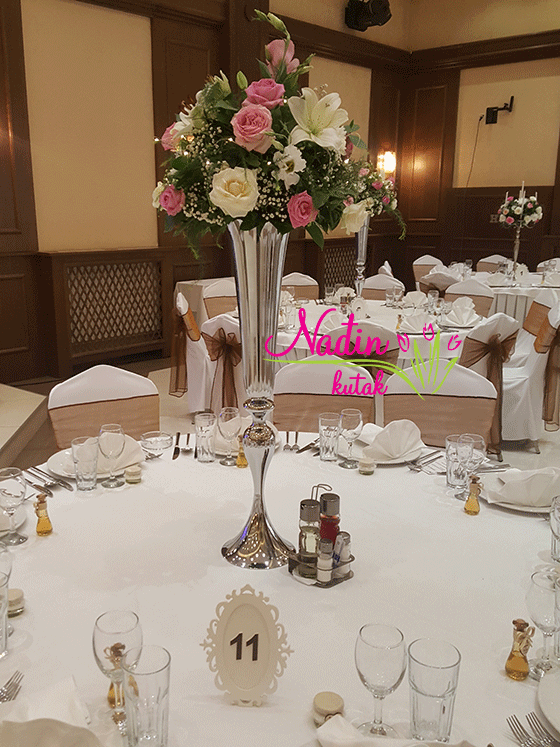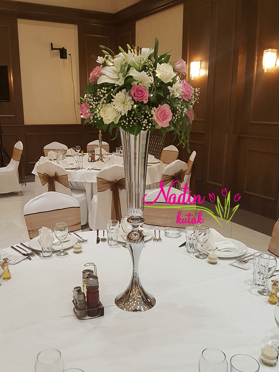 aranžmani sa ružama,ljiljanima,lizijantusom i margaretama , obavijeni nežnim lampicama, na visokoj srebrnoj vazi