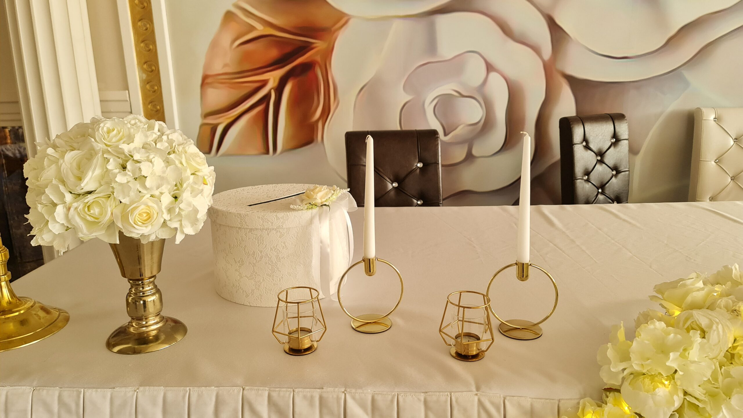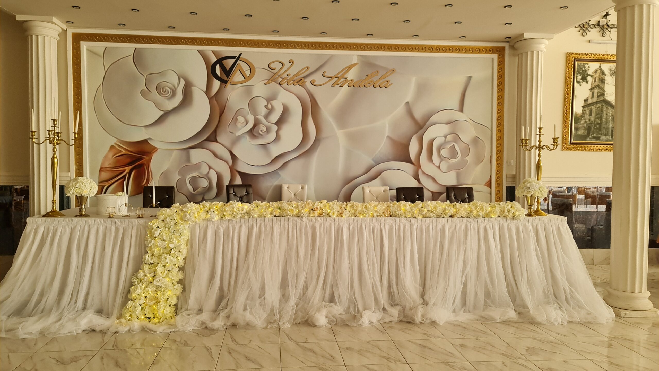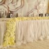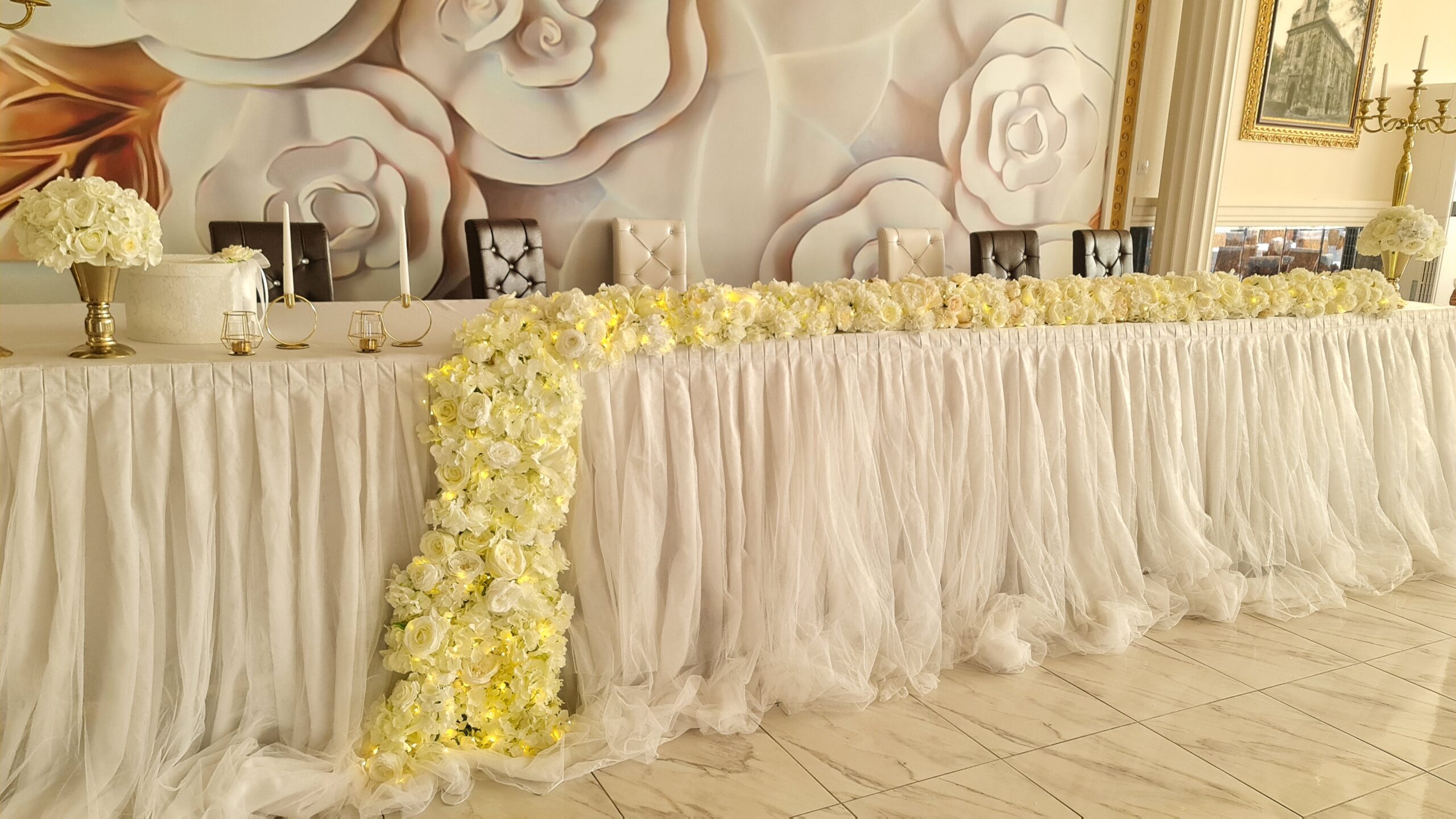 Kompletna dekoracija mladenačkog stola svilenim cvećem bez zelenila sa oblak suknjicom i lampicama 36000 dinara.