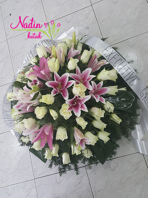 venac sa orijentalnim ljiljanima i belim ružama