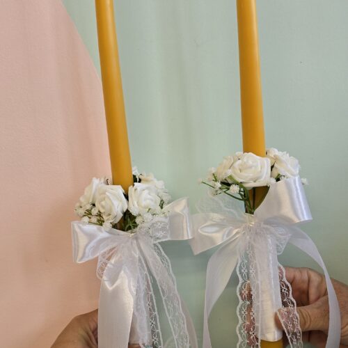 Voštana sveća dekorisana trajnim svilenim cvećem, vezeno srpsko platn0 , kutijica za premen kose- set za krštenje upakovan u luksuznu kutiju.
